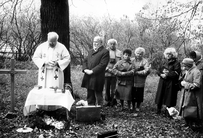 Msza świę­ta na tere­nie klasz­to­ru w Ostasz­ko­wie, po raz pierw­szy odpra­wio­na w inten­cji pomor­do­wa­nych (piel­grzym­ka do Ostasz­ko­wa, Twe­ru i Mied­no­je, 22–28 listo­pa­da 1991)
