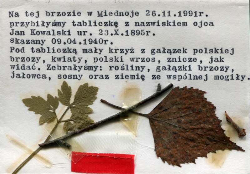 Tyl­ko one mi pozo­sta­ły w pamię­ci po chwi­lach spę­dzo­nych z moim kocha­ny Ojcem. Byłam małą dziew­czyn­ką, kie­dy żegna­li­śmy się, kie­dy po raz ostat­ni mnie przy­tu­lił. I te chwi­le towa­rzy­szy­ły mi, kie­dy cho­dzi­łam po „nie­ludz­kiej zie­mi”, pro­wa­dząc dia­log ze sobą i z Nim, przy­wo­łu­jąc minio­ny bez­pow­rot­nie czas. Wzię­łam udział w czte­rech piel­grzym­kach na cmen­ta­rze, któ­re przy­tu­li­ły Ofia­ry Zbrod­ni Katyń­skiej. Każ­dy pobyt był ogrom­nym wstrzą­sem psy­chicz­nym; wpły­wał też na moje zdro­wie fizycz­ne, co za każ­dym razem odcho­ro­wa­łam. Tego prze­ży­cia nie moż­na zamknąć w paru sło­wach. Po pro­stu się nie da. Tra­gizm naszych naj­bliż­szych, któ­rym bestial­sko ode­bra­no życie, ale i nas, rodzin, któ­rym znisz­czo­no przy­szłość.