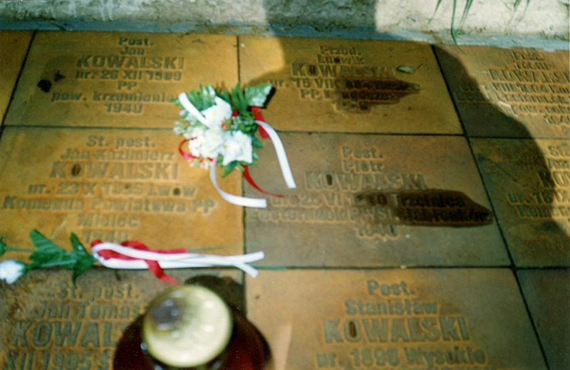 Krzyż z tablicz­ką i zdję­ciem Jana Kazi­mie­rza Kowal­skie­go – przy krzy­żu Zofia Pła­ska (cór­ka) i Jadwi­ga Kowal­ska (syno­wa) (2 wrze­śnia 2000)