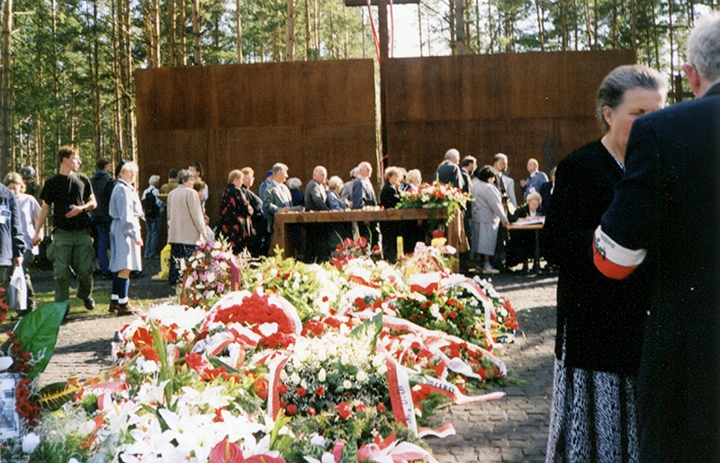 Uro­czy­stość poświę­ce­nia Pol­skie­go Cmen­ta­rza Wojen­ne­go w Mied­no­je: ołtarz i ścia­na z nazwi­ska­mi Pomor­do­wa­nych (2 wrze­śnia 2000)