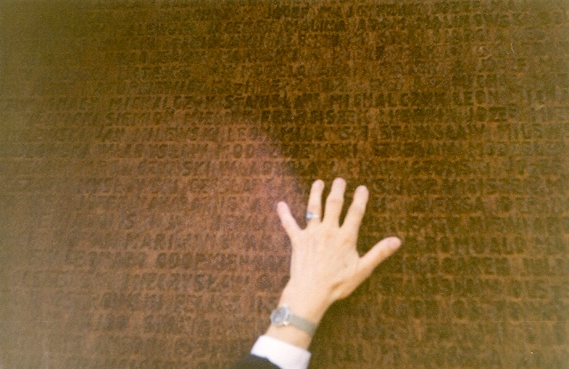 Ścia­na z nazwi­ska­mi Pomor­do­wa­nych – dłoń cór­ki przy nazwi­sku Jana Kazi­mie­rza Kowal­skie­go (2 wrze­śnia 2000)
