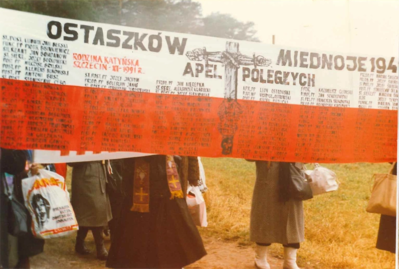 Piel­grzym­ka do Mied­no­je (trans­pa­rent z nazwi­ska­mi pomor­do­wa­nych, któ­rych rodzi­ny osia­dły w Szcze­ci­nie)