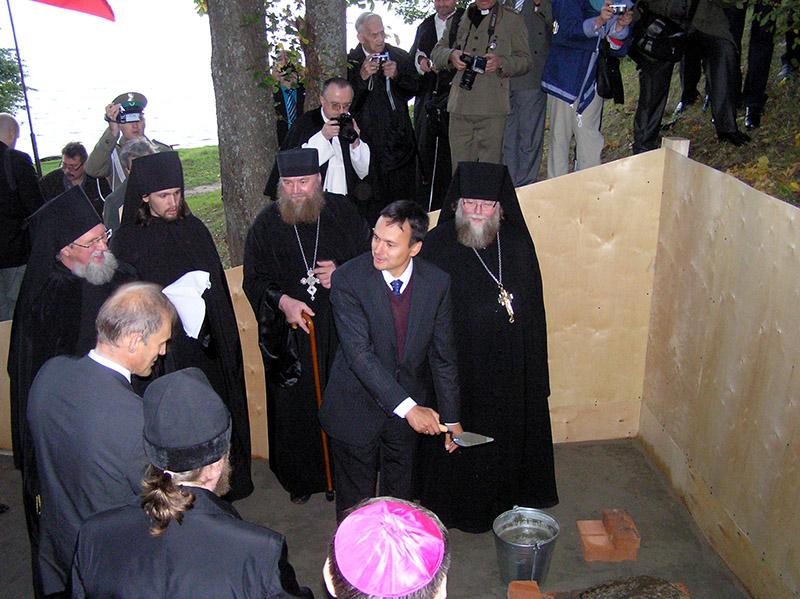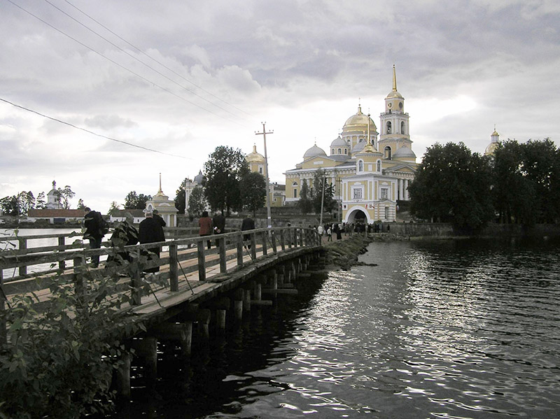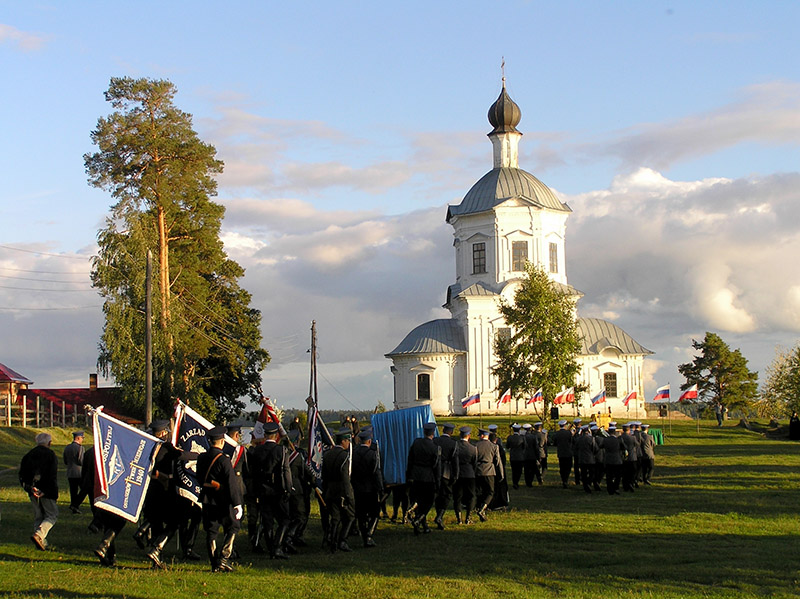 Po nie­dłu­gim cza­sie zaczę­li­śmy przy­go­to­wy­wać się do uro­czy­sto­ści, któ­ra mia­ła nastą­pić przy jed­nej z cer­kwi mona­sty­ru. Kie­dyś cer­kwi było tam praw­do­po­dob­nie trzy­dzie­ści. Jesz­cze nie­któ­re zosta­ły. Ufor­mo­wa­ni w pochód podą­ży­li­śmy do głów­nej z nich. W uro­czy­stym orsza­ku szła nasza pol­ska poli­cja w histo­rycz­nych przed­wo­jen­nych stro­jach, orkie­stra i piel­grzy­mi. Zacie­ka­wie­ni byli­śmy, co się będzie dalej dzia­ło. Przed głów­nym wej­ściem do świą­ty­ni cze­ka­li na nas duchow­ni kato­lic­cy (dwóch księ­ży z Czę­sto­cho­wy) i pra­wo­sław­ni (wysłan­ni­cy patriar­chy Cyry­la). Pochód otwie­rał obraz z wize­run­kiem Mat­ki Boskiej Czę­sto­chow­skiej, któ­ry do orsza­ku prze­nie­sio­ny został – ze spe­cjal­ne­go podium przed iko­no­sta­sem w cer­kwi – przez poli­cjan­tów. W koń­cu wszy­scy w kom­ple­cie wyru­szy­li­śmy. Była cisza. Jedy­nie orkie­stra gra­ła kościel­ne pie­śni. Dotar­li­śmy przed nie­wiel­ką cer­kiew­kę. Tam były powi­ta­nia i dłu­gie prze­mo­wy. Szcze­gól­nie pięk­ny był moment powi­ta­nia się dostoj­ni­ków Kościo­ła pra­wo­sław­ne­go i kato­lic­kie­go. Każ­dy prze­ma­wiał w swo­im języ­ku, ale tłu­ma­czo­ne było wszyst­ko. Ser­ce rosło, kie­dy się to sły­sza­ło. Uro­czy­sto­ści trwa­ły dwie lub nawet trzy godzi­ny. Sta­li­śmy wszy­scy bli­sko sie­bie, żeby nie mar­z­nąć, bo choć pogo­da była pięk­na, to wiał mroź­ny wiatr od jezio­ra. Było zim­no, jed­nak te wyjąt­ko­we chwi­le nie pozwa­la­ły na tym się sku­piać. Zresz­tą w ogó­le nie myśle­li­śmy o nie­do­god­no­ściach, bo byli­śmy prze­ję­ci wyda­rze­nia­mi tego dnia.